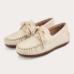 נעלי מוקסין אלגנטיות לבנים, עם סוליה שטוחה ונוחה ושרוכי קשירה.