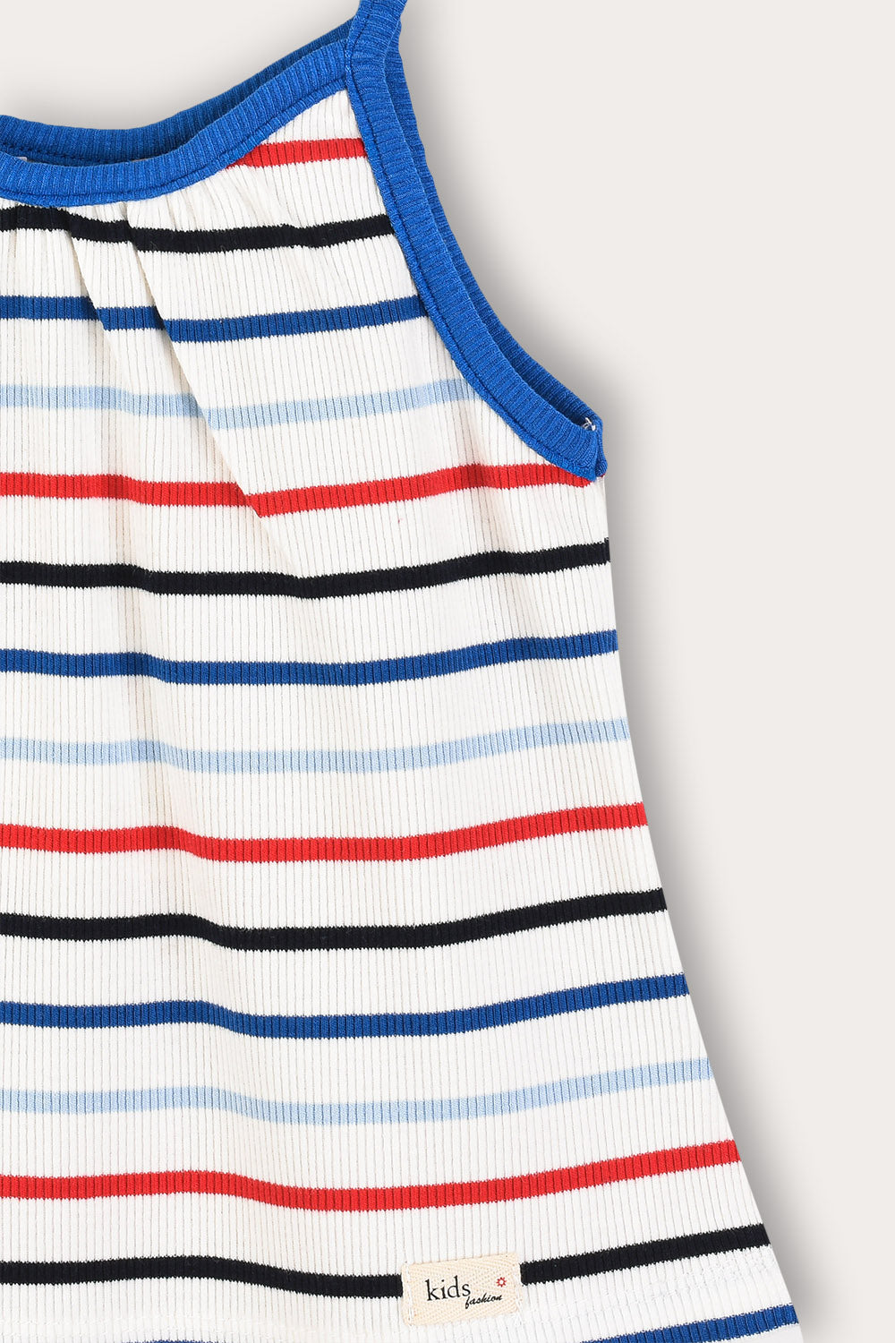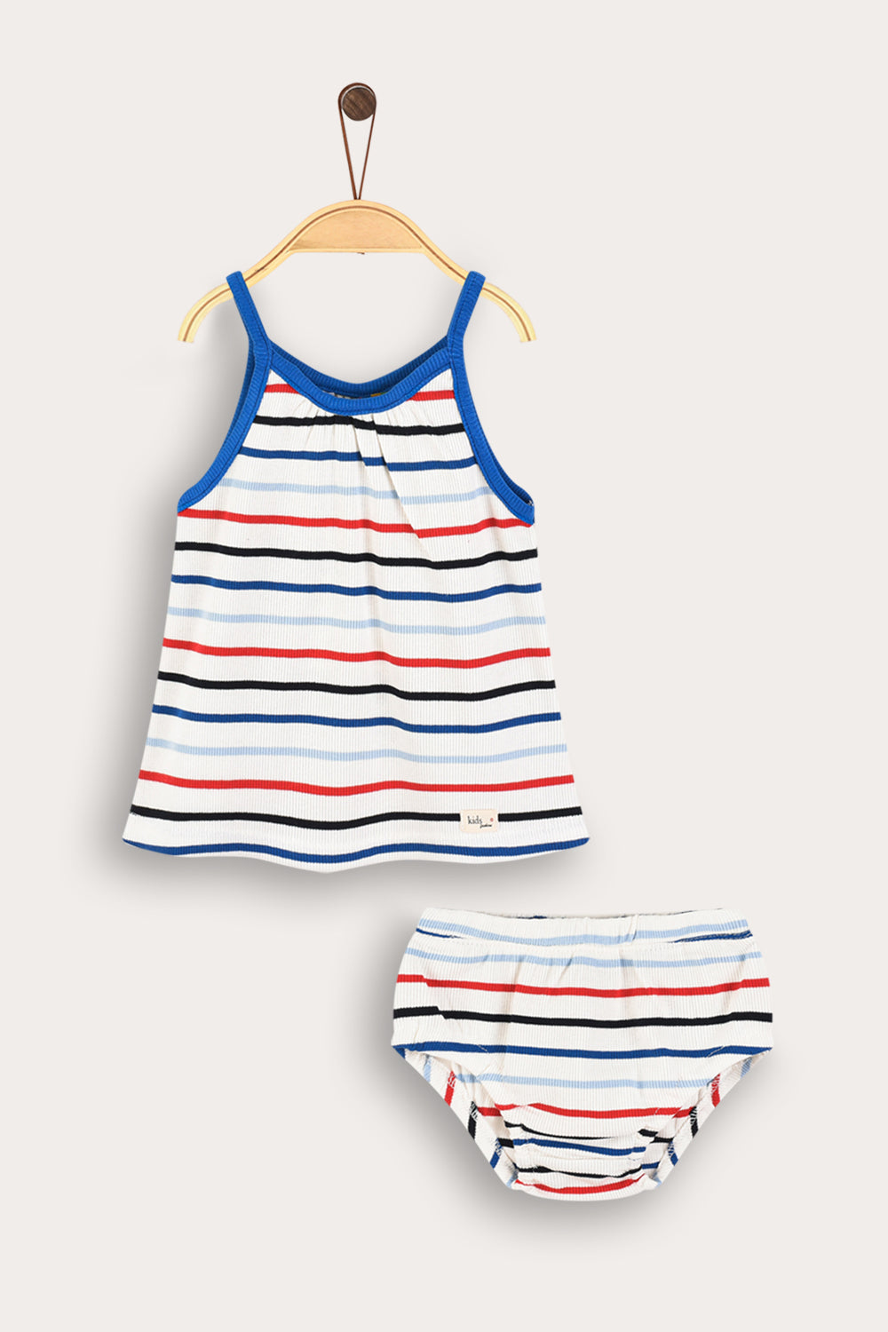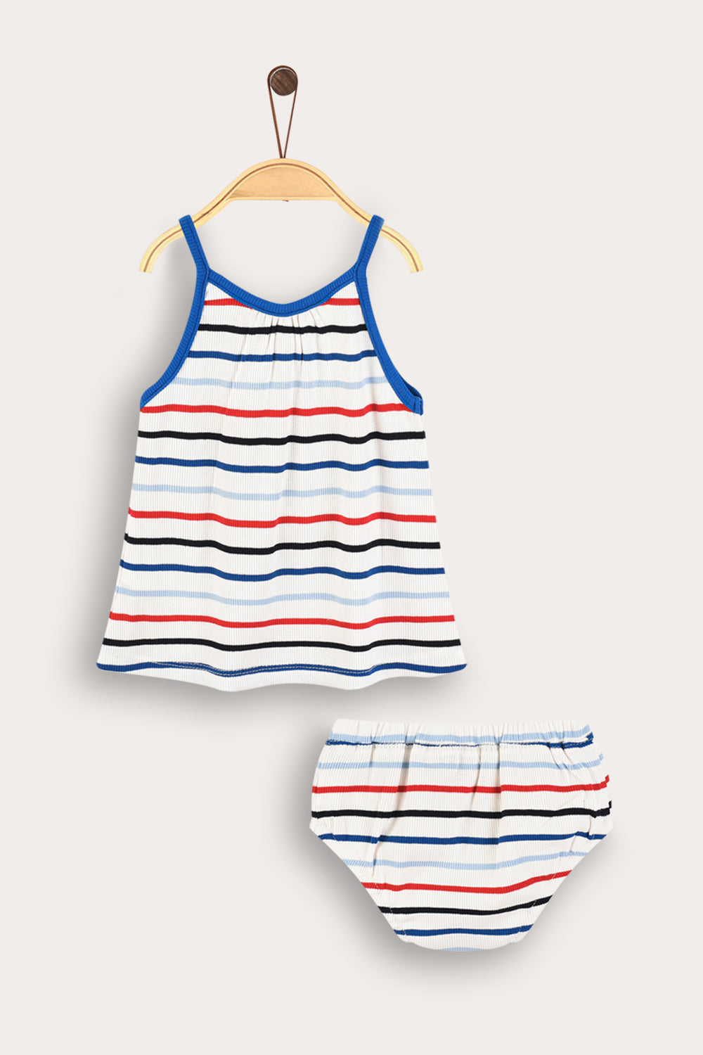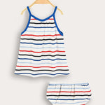 סט שני חלקים לתינוקת, עשוי מבד ריב גמיש ונעים - לנוחות מירבית לאורך כל היום. החלק העליון גופיית כתפיות בגזרה מתרחבת. החלק התחתון תחתונים עם סיומת אלסטית בעיצוב תואם. דוגמת פסים צבעונית - משלימה הופעה מתוקה ואופנתית, המתאימה לשימוש יום יומי ולטיולים עם הקטנטנות.