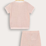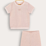 סט שני חלקים לתינוקות, בעיצוב יוניסקס המתאים לבנים ולבנות כאחד. עשוי מבד סריג נעים וגמיש - לנוחות מירבית לאורך היום. החלק העליון חולצה עם שרוולים קצרים, פתח צוואר עגול והדפס קדמי מתוק. החלק התחתון מכנסיים קצרים בעיצוב תואם המשלים הופעה נאה ומסודרת, אידיאלית לשבתות, חגים ואירועים משפחתיים.