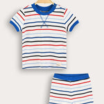 סט שני חלקים לתינוק, עשוי מבד ריב גמיש ונעים - לנוחות מירבית לאורך כל היום. החלק העליון חולצה עם שרוולים קצרים, פתח צוואר עגול וכפתורים להלבשה מהירה וקלה. החלק התחתון מכנסיים קצרים בעיצוב תואם. דוגמת פסים צבעונית ותפרים מודגשים - משלימים הופעה נאה ואופנתית, המתאימה לשימוש יום יומי ולטיולים עם הקטנטנים.