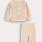 סט שני חלקים לברית מילה או לבריתה, בעיצוב יוניסקס המתאים לבנים ולבנות כאחד. עשוי מבד סריג מחורר רך ונעים, בדוגמת מעויינים קלאסית. החלק העליון חולצת מעטפת עם שרוולים ארוכים. החלק התחתון מכנסיים ארוכים בעיצוב תואם - המשלים הופעה נקיה ומסודרת.