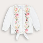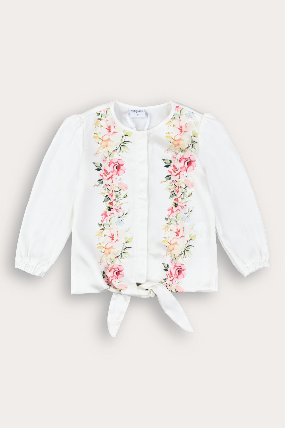 חולצת בנות בעיצוב חגיגי המתאים במיוחד לשבתות. הגזרה כוללת כפתורים לכל האורך שרוולים נפוחים וקשירה קדמית ליצירת נפח מחמיא. הדפס פרחים משלים הופעה חיננית ומרשימה.