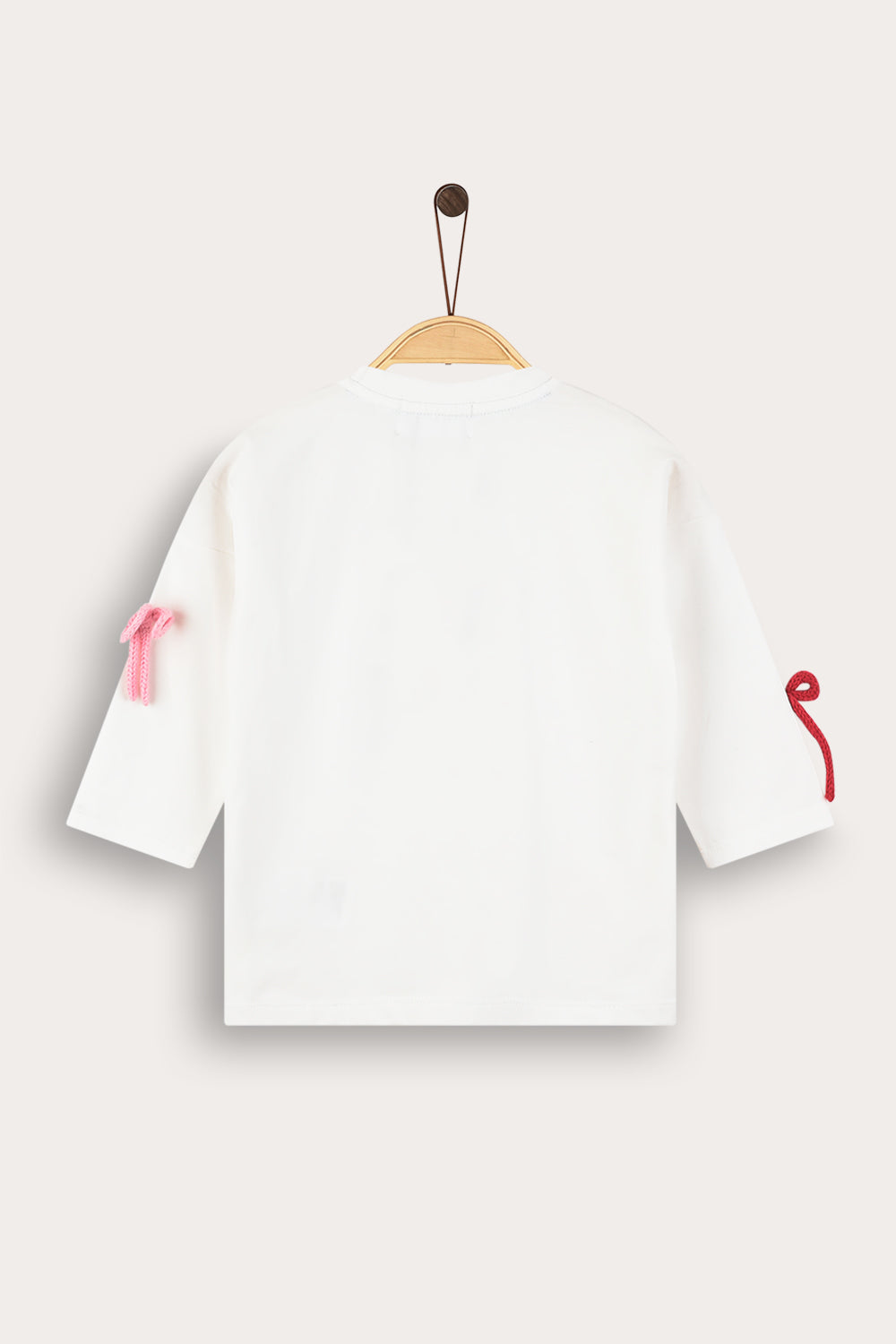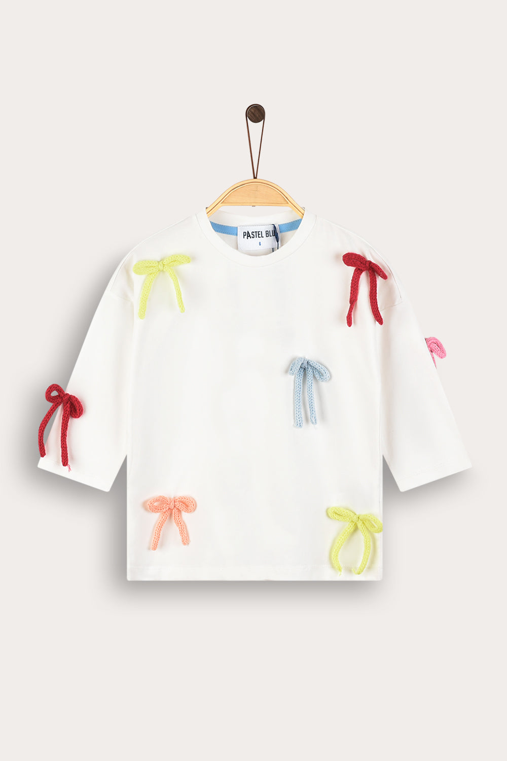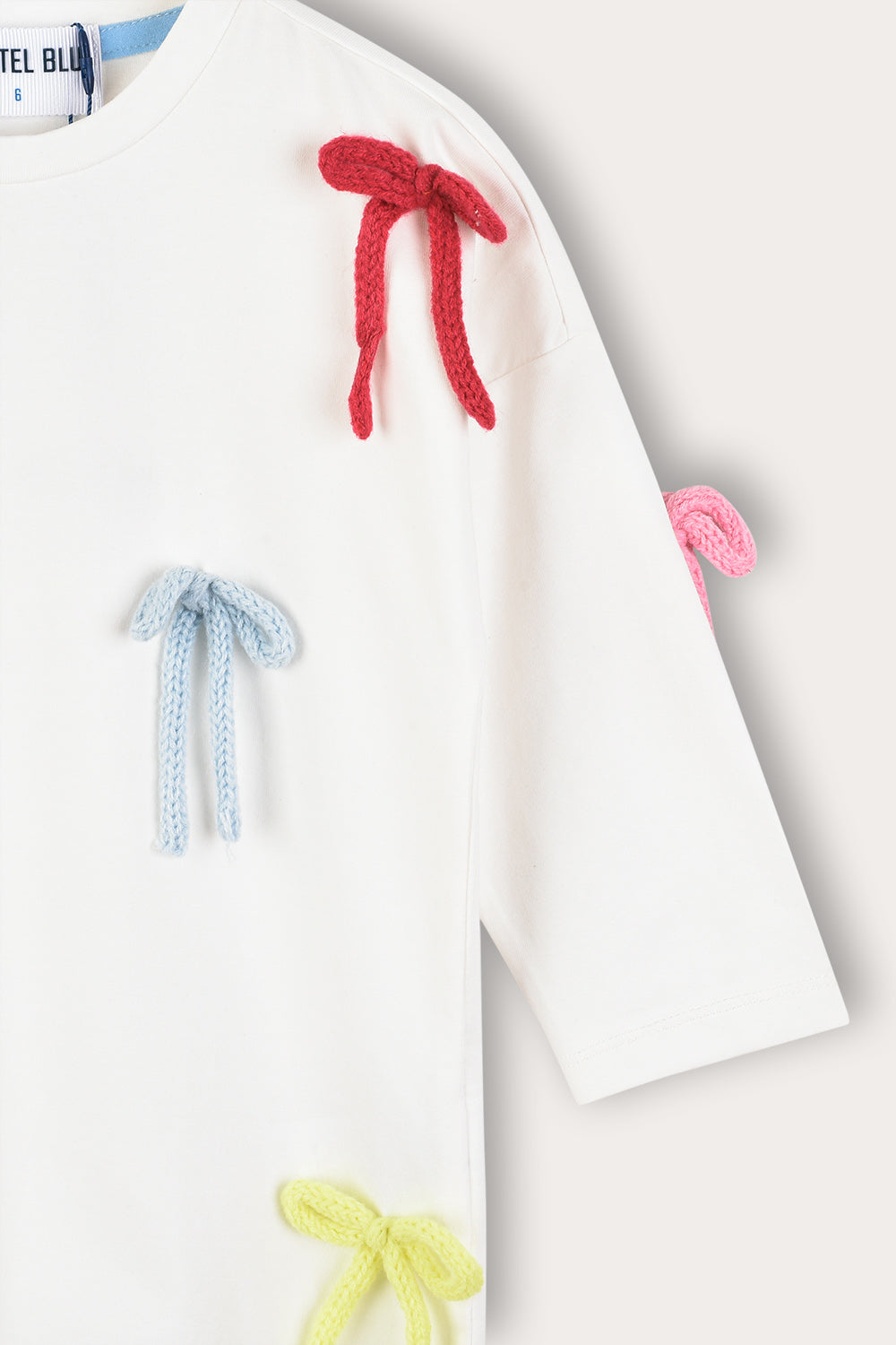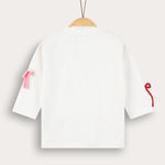חולצת טי שירט לבנות, בעיצוב אופנתי וייחודי, עשויה מבד תערובת כותנה איכותי ונושם לנוחות מירבית לאורך כל היום. הגזרה כוללת פתח צוואר עגול ושרוולים פרקטיים באורך 3/4. הדפס פסים וקישוטי סרטי פפיונים - משלימים הופעה חיננית ועדכנית, בחירה מושלמת לשילוב עם חצאיות ולמראה מתוק ומסודר.
