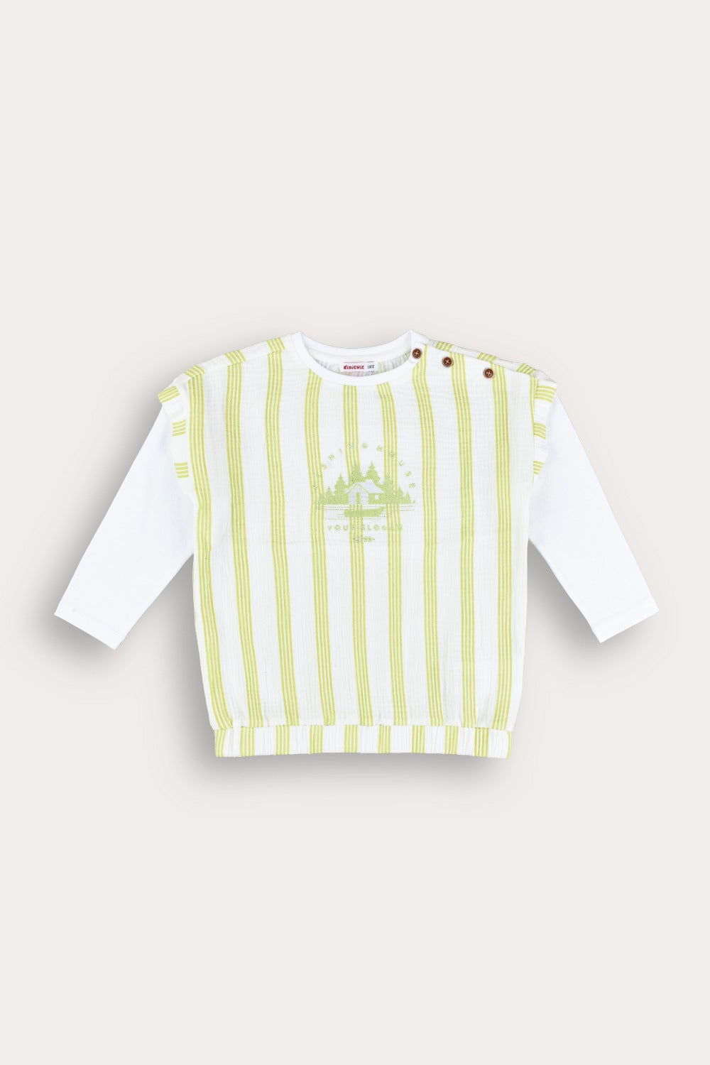 חולצת בנות בעיצוב פסים קלאסי, עשויה מבד כותנה איכותי ונושם - לנוחות מירבית לאורך כל היום. הגזרה כוללת מראה של שכבות עם וסט קדמי ושרוולים באורך 3/4, פתח צוואר עגול וכיווצים בתחתית הבגד. כפתורים בכתף ורקמה קדמית - משלימים הופעה חיננית ומסודרת.