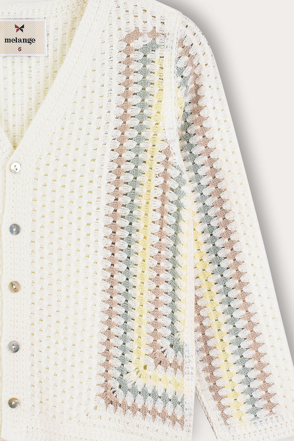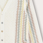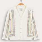 קרדיגן חגיגי לבנים, עשוי מבד סריג גמיש ונעים, עם חורי אוורור - לנוחות מירבית לאורך היום. הגזרה כוללת שרוולים ארוכים, פתח צוואר עמוק וסגירת כפתורים קדמית. דוגמת קרושה גיאומטרית - משלימה הופעה נאה ומסודרת, המתאימה לשבתות, חגים ואירועים משפחתיים.