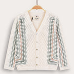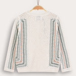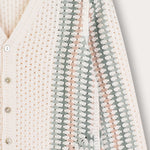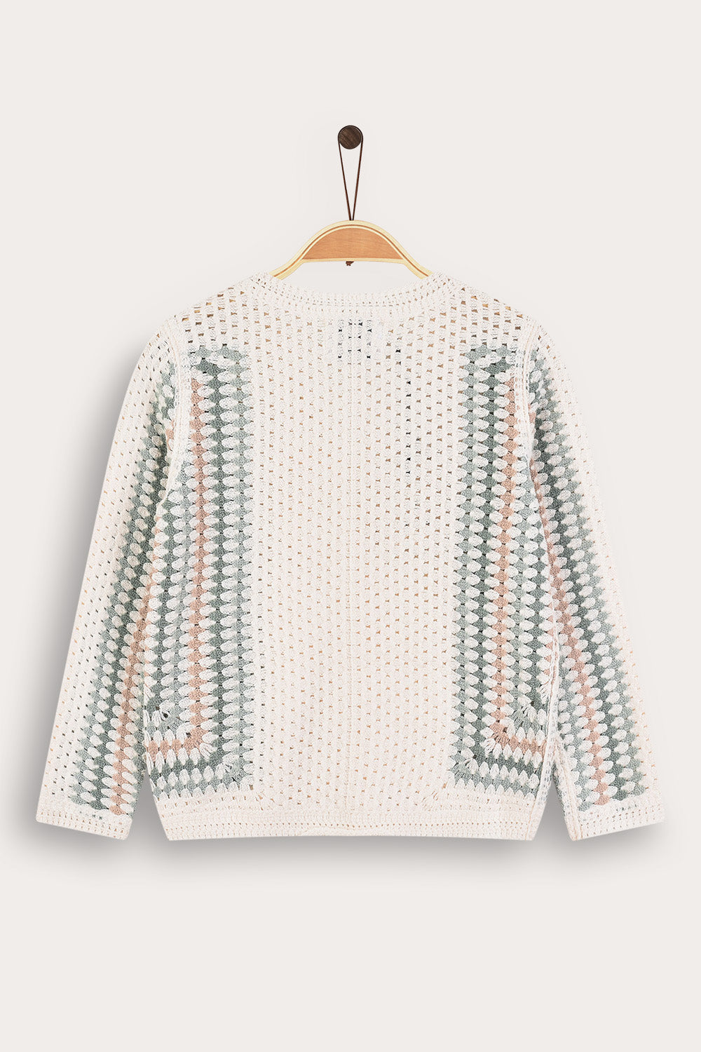קרדיגן חגיגי לבנים, עשוי מבד סריג גמיש ונעים, עם חורי אוורור - לנוחות מירבית לאורך היום. הגזרה כוללת שרוולים ארוכים, פתח צוואר עמוק וסגירת כפתורים קדמית. דוגמת קרושה גיאומטרית - משלימה הופעה נאה ומסודרת, המתאימה לשבתות, חגים ואירועים משפחתיים.