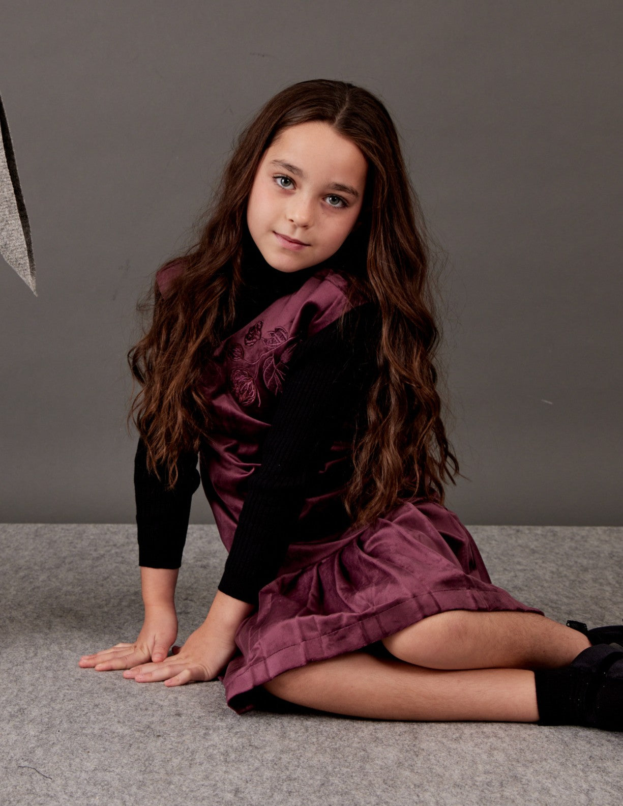 שמלת קטיפה עם רקמת פרחים - אפור