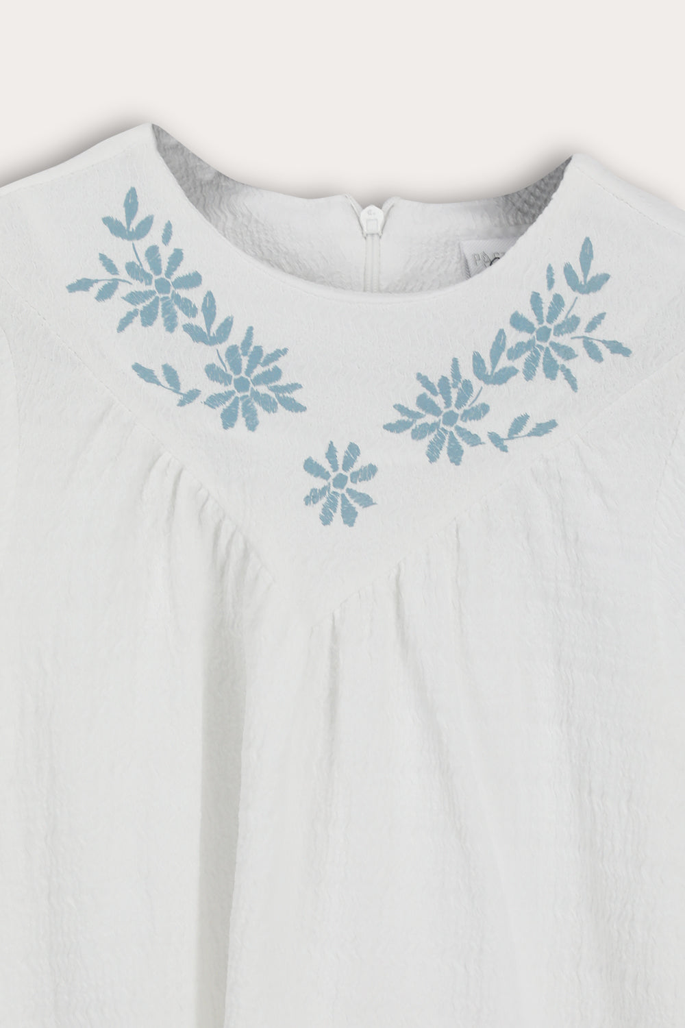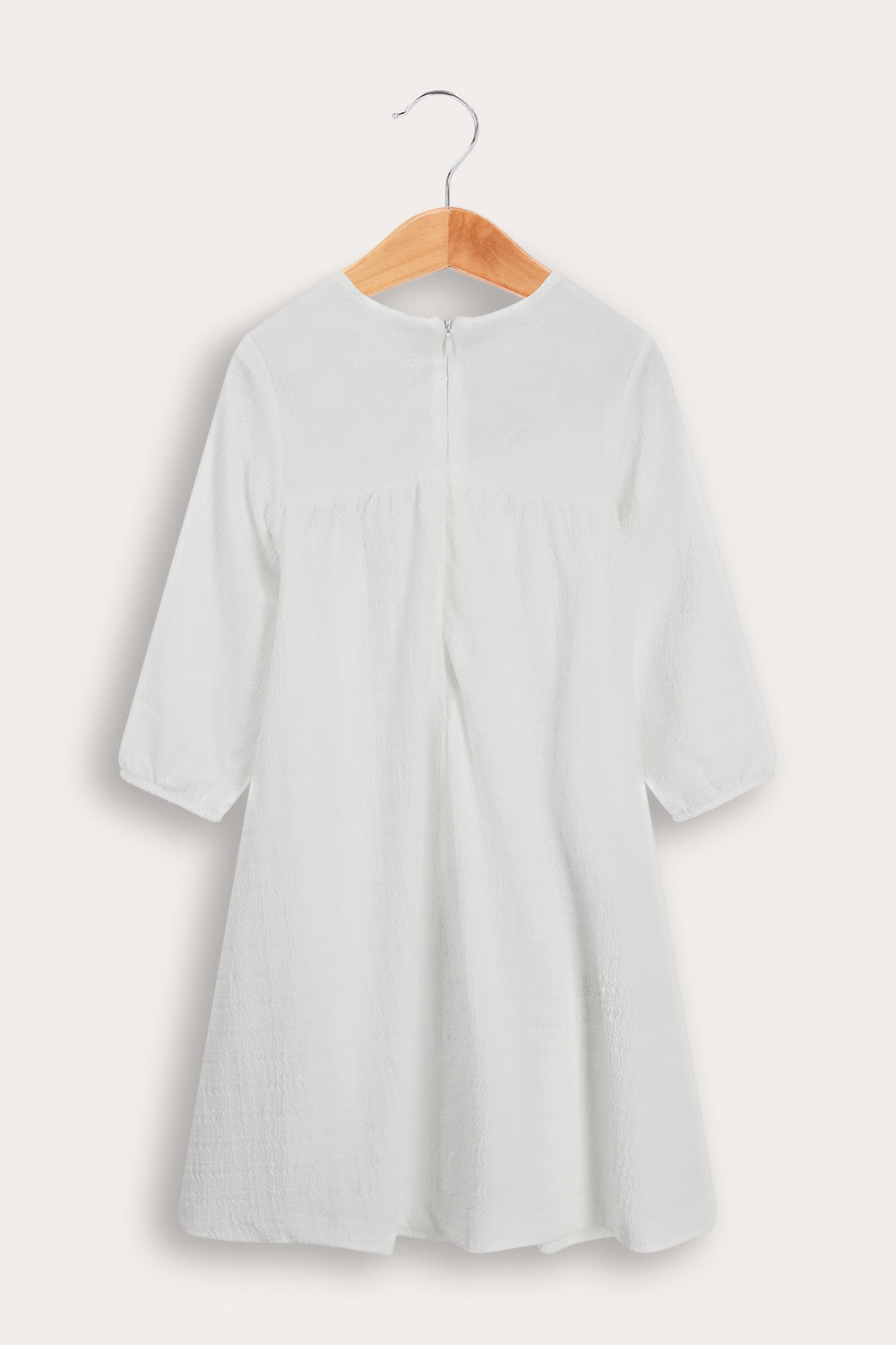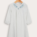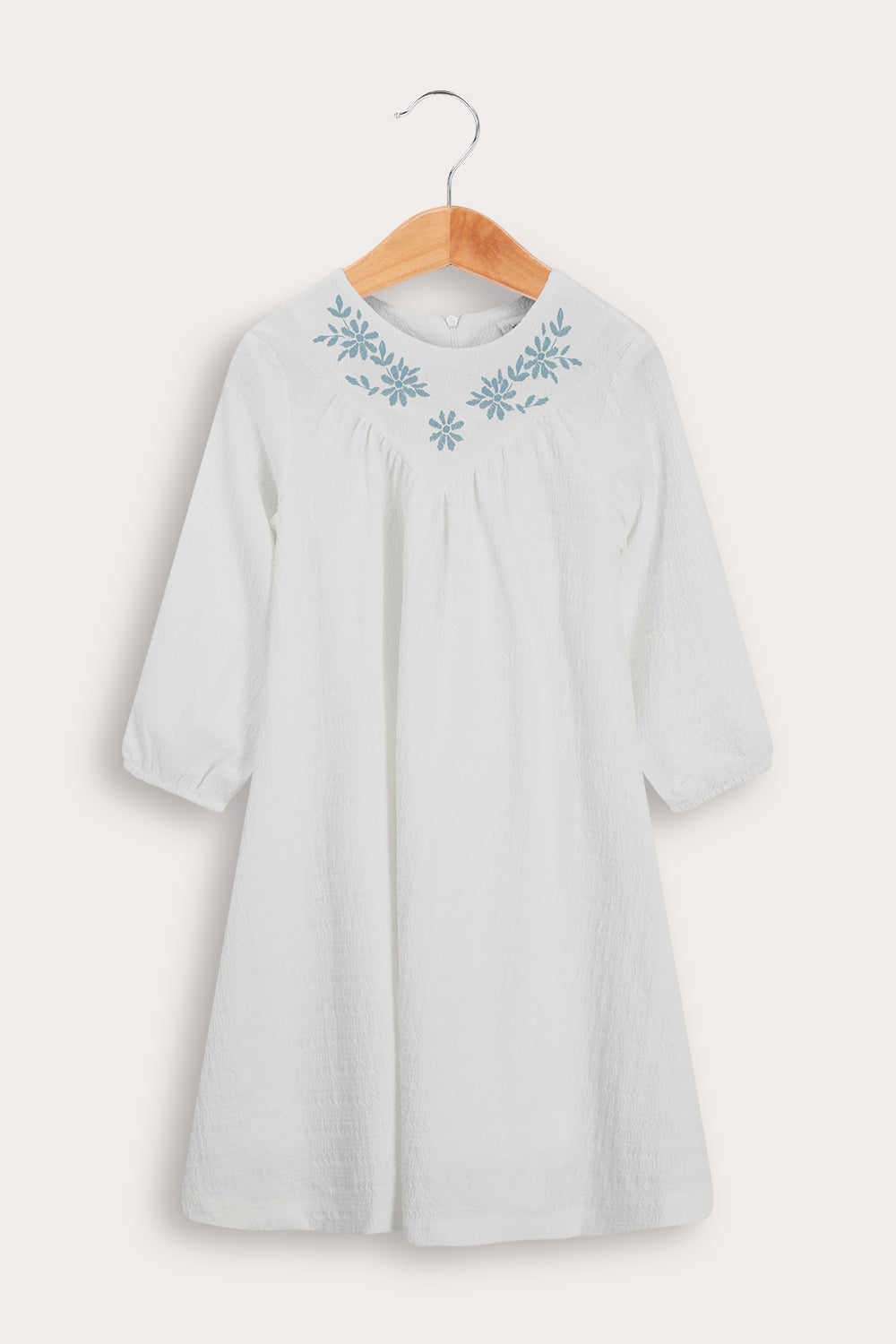 שמלה חגיגית לבנות, עשויה מבד אריג עדין ונעים. הגזרה כוללת שרוולים ארוכים, פתח צוואר עגול וכיווצים ליצירת נפח וחופש תנועה מקסימלי. רקמת פרחים עדינה - משלימה הופעה נאה וחיננית, המתאימה לשבתות, חגים ואירועים משפחתיים.