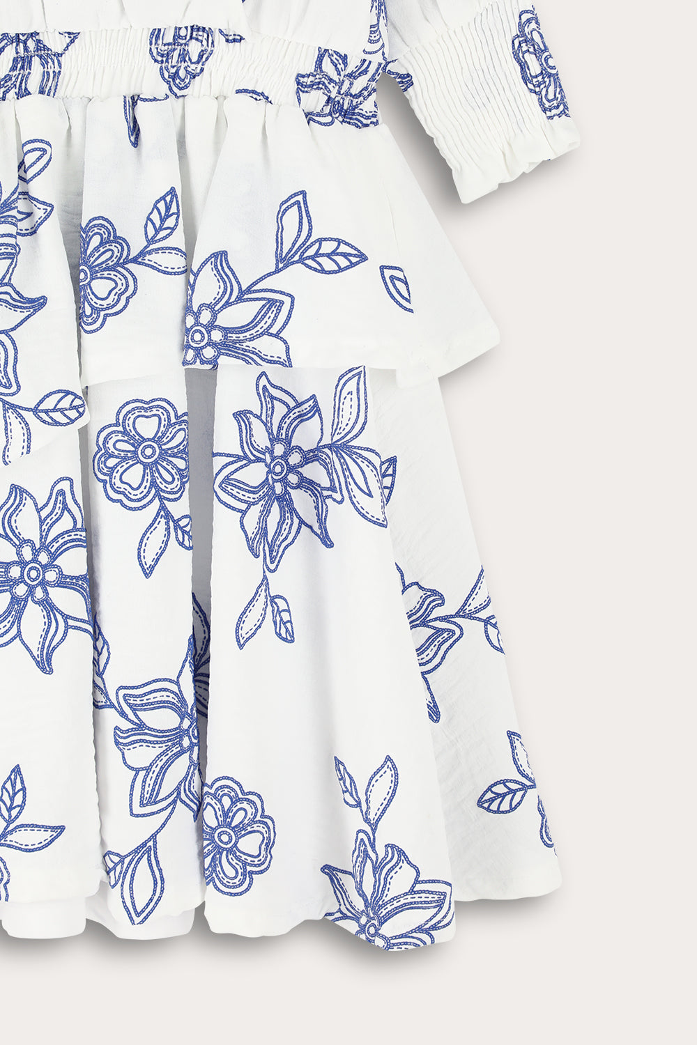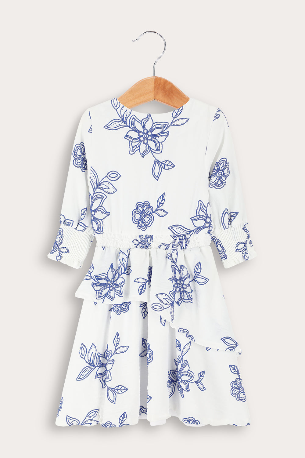 שמלה חגיגית לבנות, בגזרת מעטפת מחמיאה. העיצוב כולל שרוולים ארוכים, חצאית שכבות וכיווצים במותניים - להתאמה מירבית ומראה מסודר. הדפס פרחים עדין - משלים הופעה חיננית ונקיה, המתאימה לשבתות, חגים ואירועים משפחתיים.