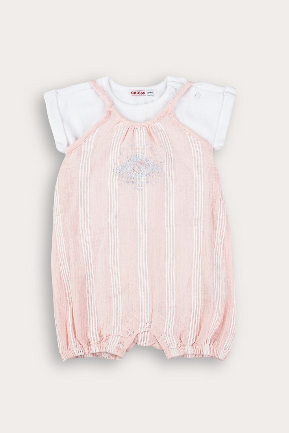 אוברול קייצי לתינוקת בעיצוב פסים קלאסי, עשוי מבד תערובת כותנה איכותי ונעים - לנוחות מירבית לאורך כל היום. הגזרה כוללת אוברול כתפיות מתוק עם כיווצים ברגליים, וחולצת טי שירט עם תיקתקים - להלבשה מהירה וקלה. רקמה קדמית משלימה הופעה חיננית ומסודרת, אידיאלי לשימוש יום יומי ולטיולים עם הקטנטנות.