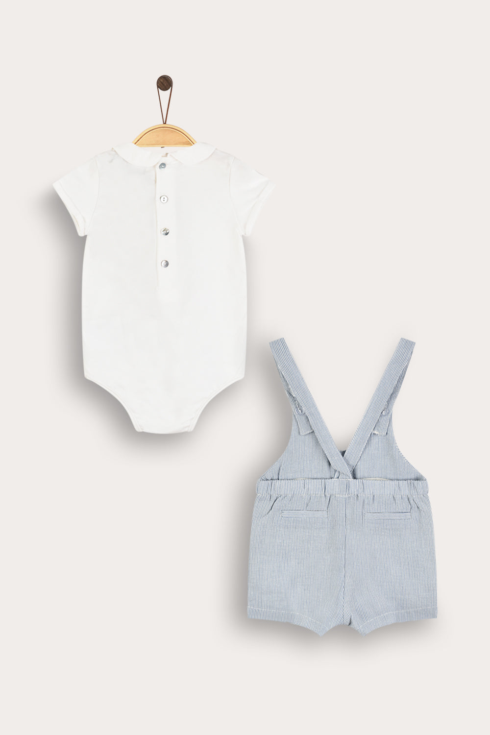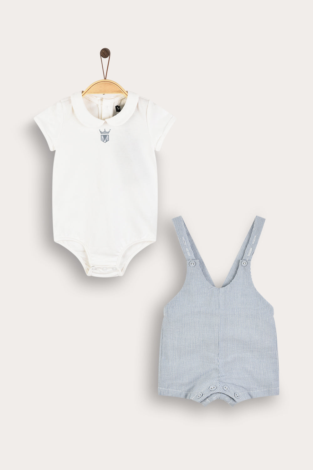 סט שני חלקים לתינוק בעיצוב חגיגי ומוקפד. החלק התחתון בגד גוף עם שרוולים קצרים וצווארון מעוגל. החלק העליון אוברול פסים עם כתפיות דקות ונוחות בסגירת כפתור, להלבשה מהירה וקלה. סמל רקמה קדמי - משלים הופעה נאה ומסודרת, אידיאלית לשבתות, חגים ואירועים משפחתיים.