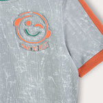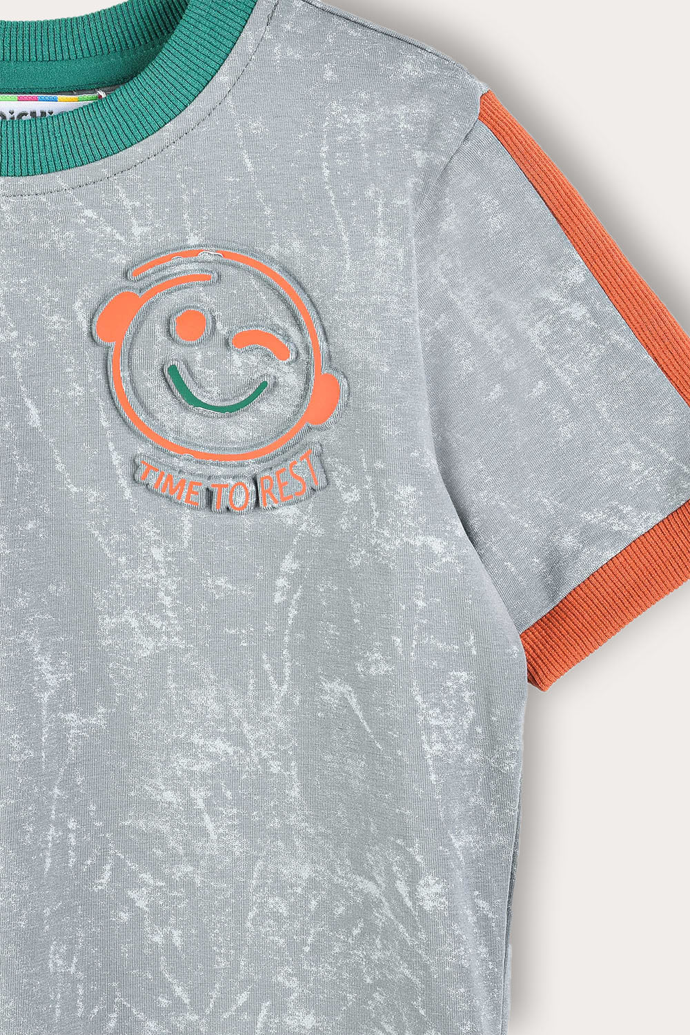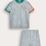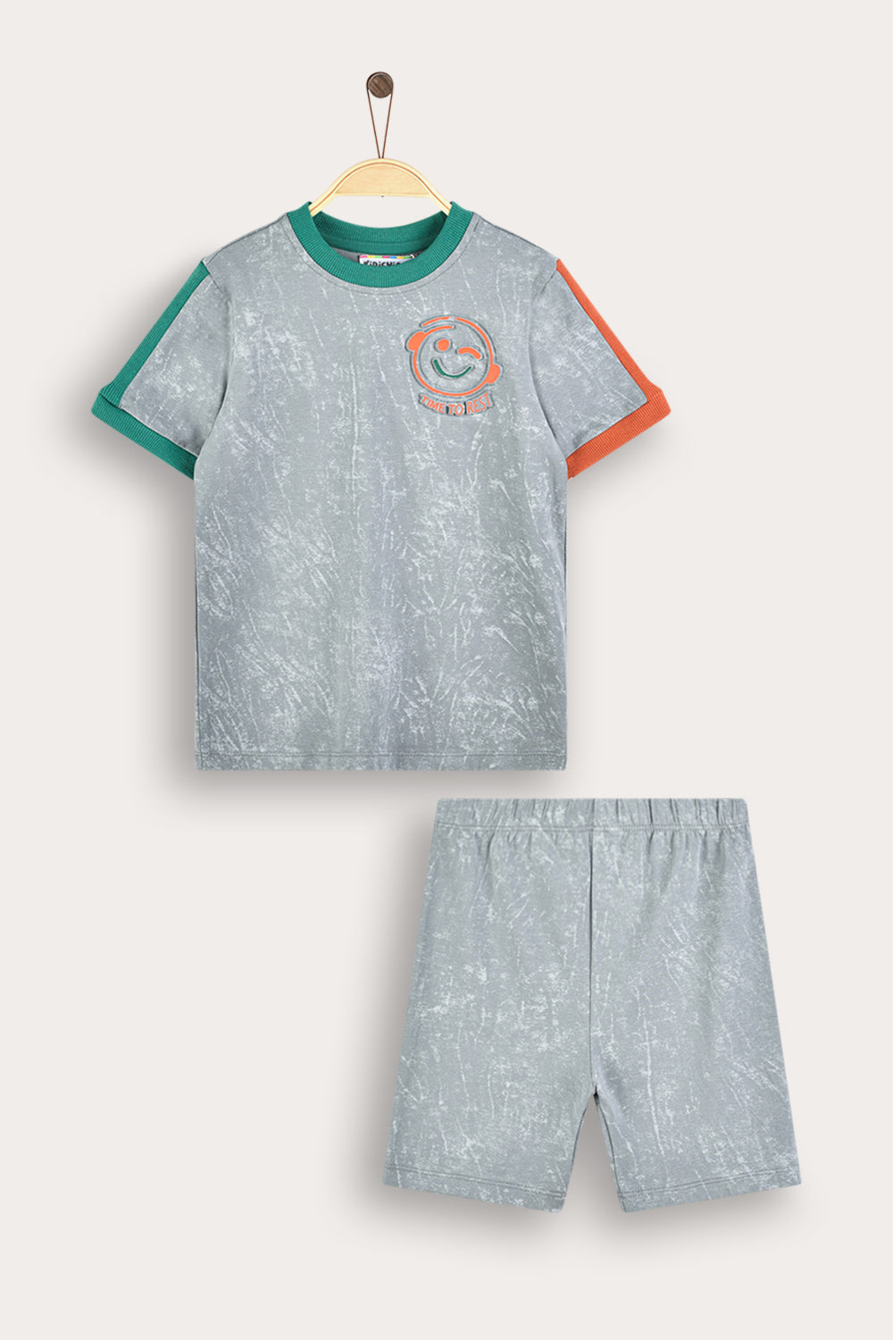 סט פיג'מה איכותי לבנים, הכולל שני חלקים בעיצוב צעיר ועדכני, בשילוב סמל מתוק בצד.