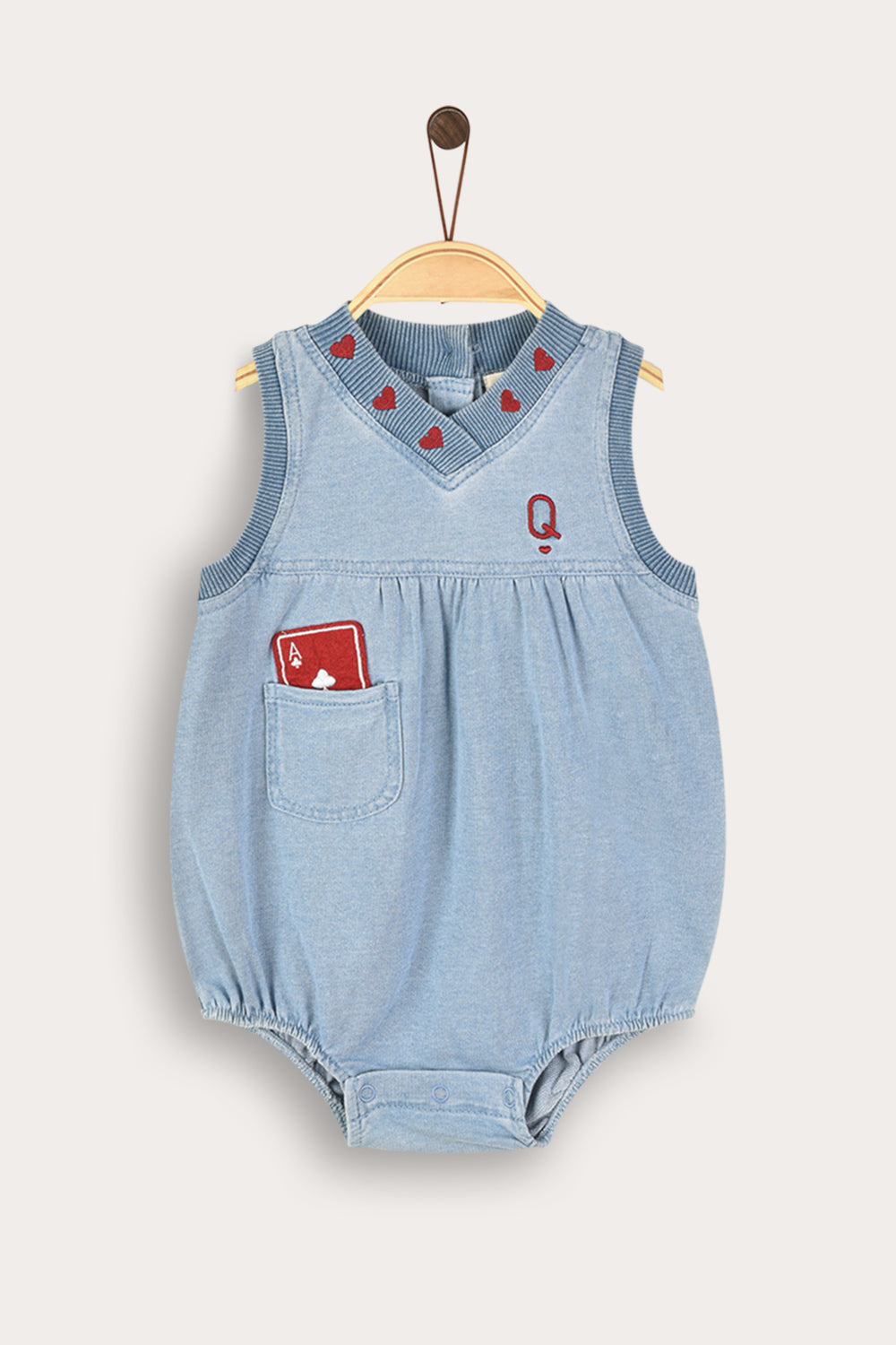 אוברול קייצי ומתוק לתינוקת, עשוי מבד ג'ינס נעים ועמיד מתערובת כותנה - לנוחות ואיכות מקסימלית. הגזרה כוללת כולל פתח צוואר וי עם ריב עבה והדפס מתוק, וכיווצים ליצירת נפח מחמיא וחופש תנועה. כיס צדדי מיוחד ורקמה עדינה במוטיב קלפים - משלימים הופעה אופנתית ונאה, המתאימה לשימוש יום יומי ולטיולים עם הקטנטנות.