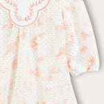 שמלה חגיגית לבנות בדגם שבת, גזרת קומות, עשויה מבד סריג קרושה.